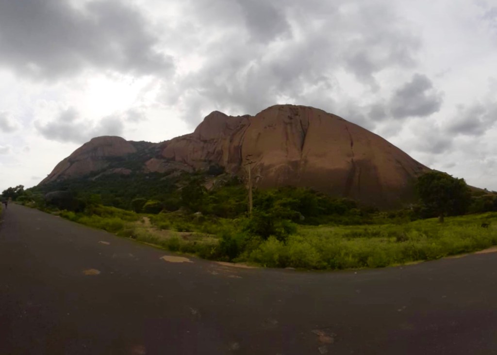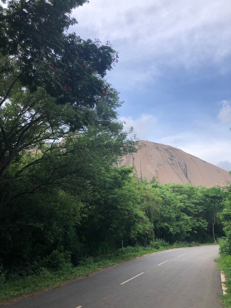 Past the Savandurga Park (closed now due to the COVID 19 pandemic) which you will find to your left hand side, you realise you are driving literally at the foot of the hill and suddenly when you ease out of a curve in the road you see the rock right in front of you! This peekaboo with the hill reminded me so much of Meteora in Greece!