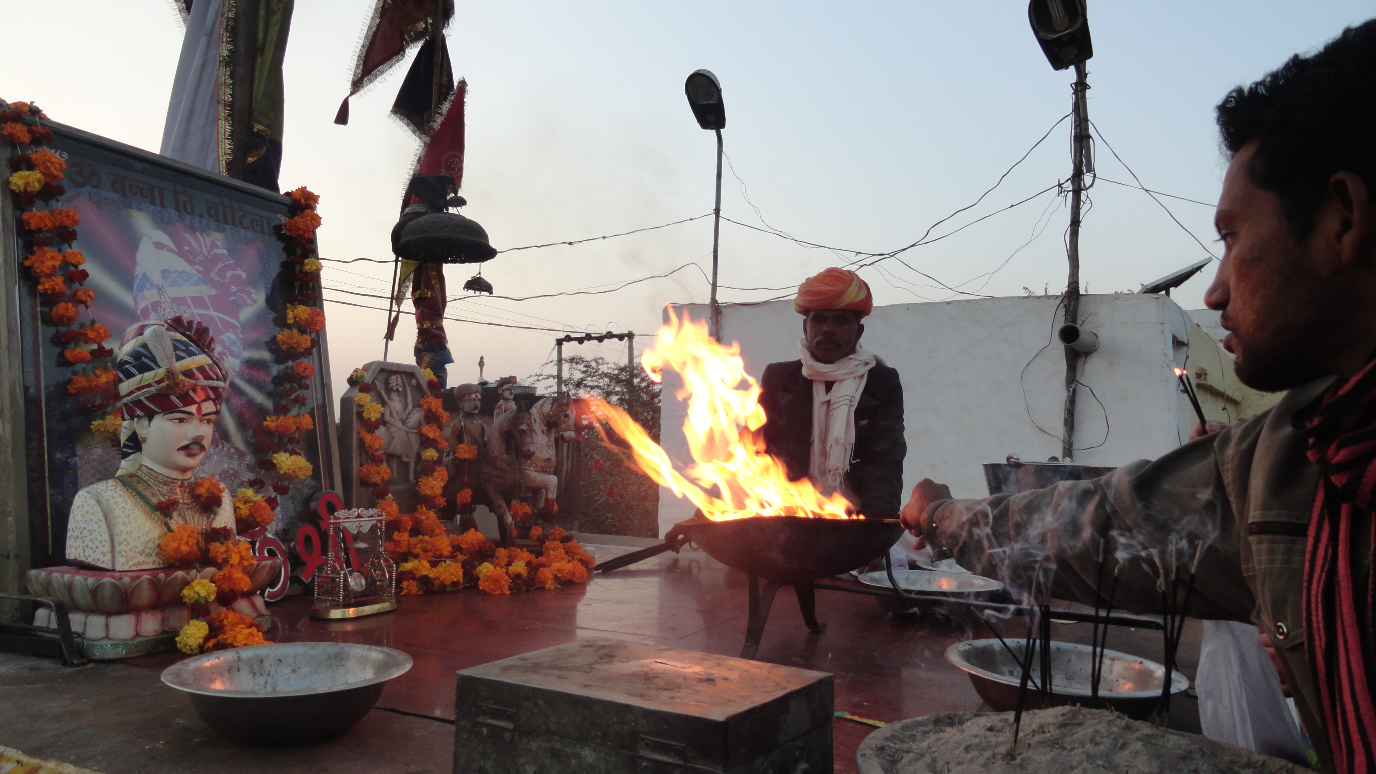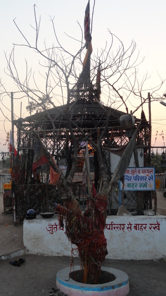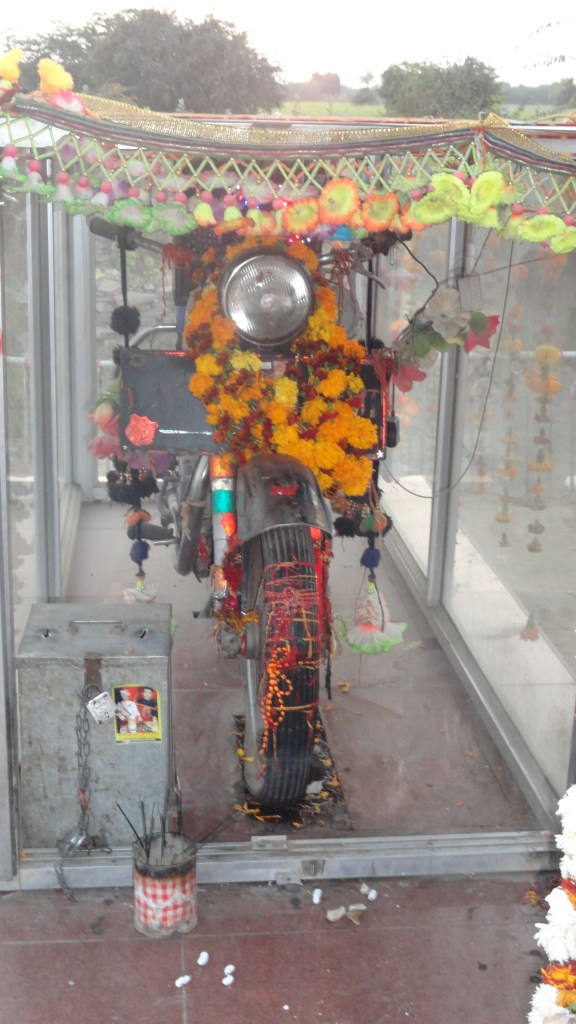 So there we were at this ramshackle of a ‘temple’. A bare tree covered with threads and bangles stood in front of a structure made of wood and reed. While we were unsure what to expect, the driver goaded us to go ‘inside’. We took off our footwear and gingerly made our way past the tree. On a raised platform there was a fire-altar (homa kunda/havan kund), a picture of a strapping young man, there were flowers, bells, a family singing bhajans….just as we were trying to understand the ambience and looking for a representation of ‘God’, we spot, of all things, a motorbike in a glass cage who happened to be the main ‘deity’ of this temple!