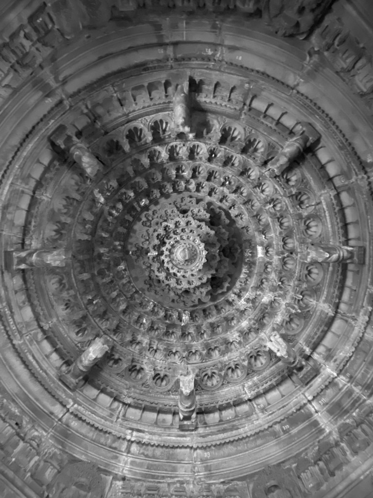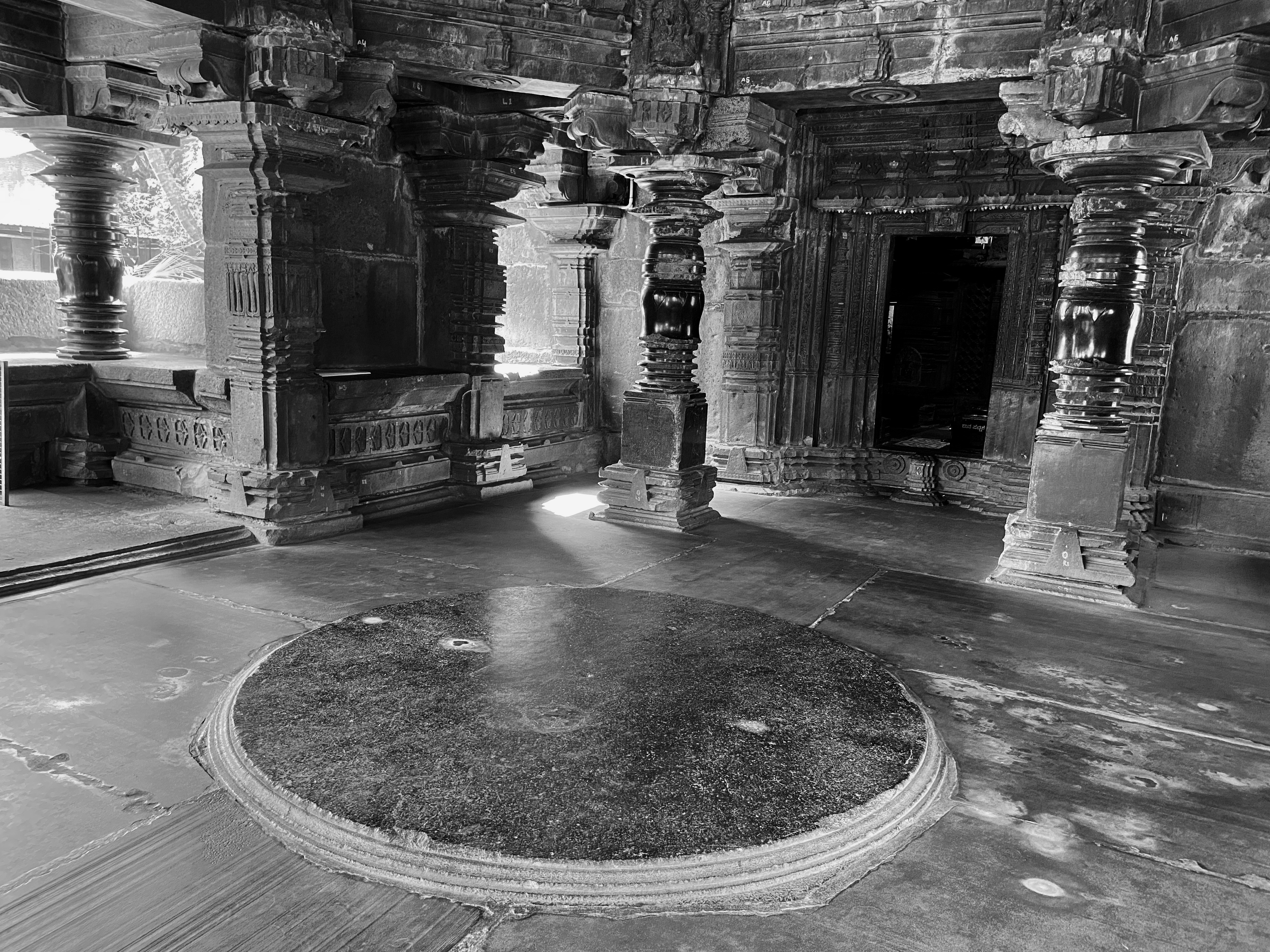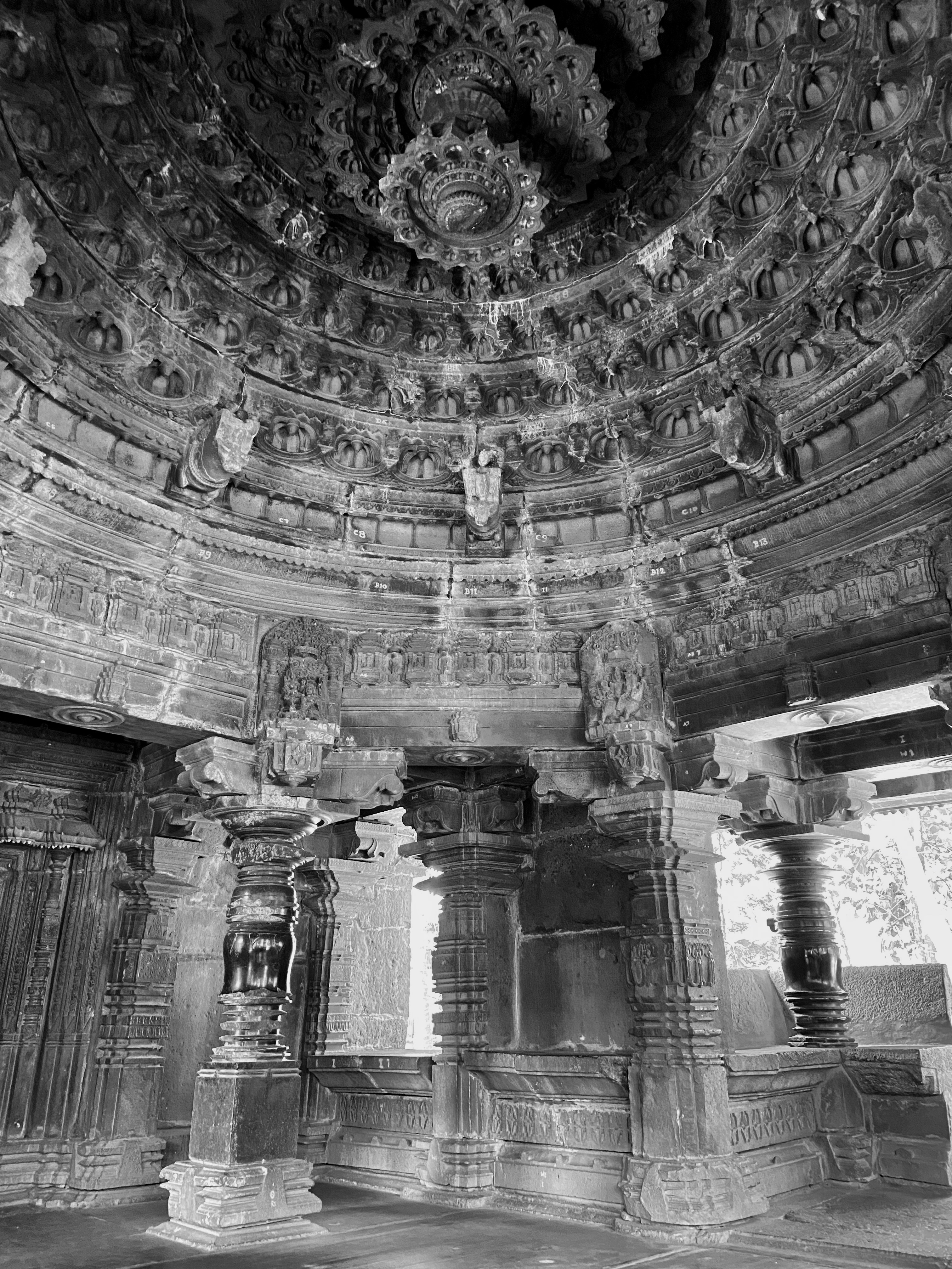 The main diety in Kamala Basadi is Shri Neminatha, the 22nd Thirthankara of Jainism. The temple was built in 1204 by Bichiraja a minister of the Ratta King Kartavirya IV. The temple gets its name from the most beautiful ceiling in the temple’s mantapa (hall) – intricately carved concentric circles of the lotus (kamala) flower with a central lotus bud. The pillars that support the ceiling are simple and carry the ‘diamond-cut’ that is quite common in the pillars at the Hoysala temple in Belur. If you have visited the bigger and better known Jain temples of Gujarath or Rajasthan you will realise that exquisitely carved ceilings are a typical feature and the lotus theme was quite common. So it was a wow moment for me to see such a lavish ceiling in a tiny little Basadi!