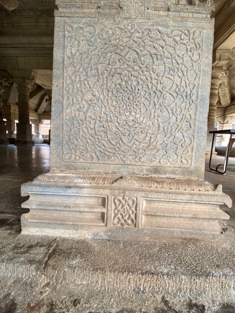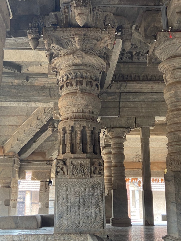 The ceiling of the main mantapa is supported on pillars, most of them with smooth finishes devoid of any embellishments, whereas a few are exquisitely carved like the one below. All the pillars have square bases and capitals. The carvings are mostly floral motifs, mythical animals, geometric patterns, and some even have the tirthankaras carved on them.
