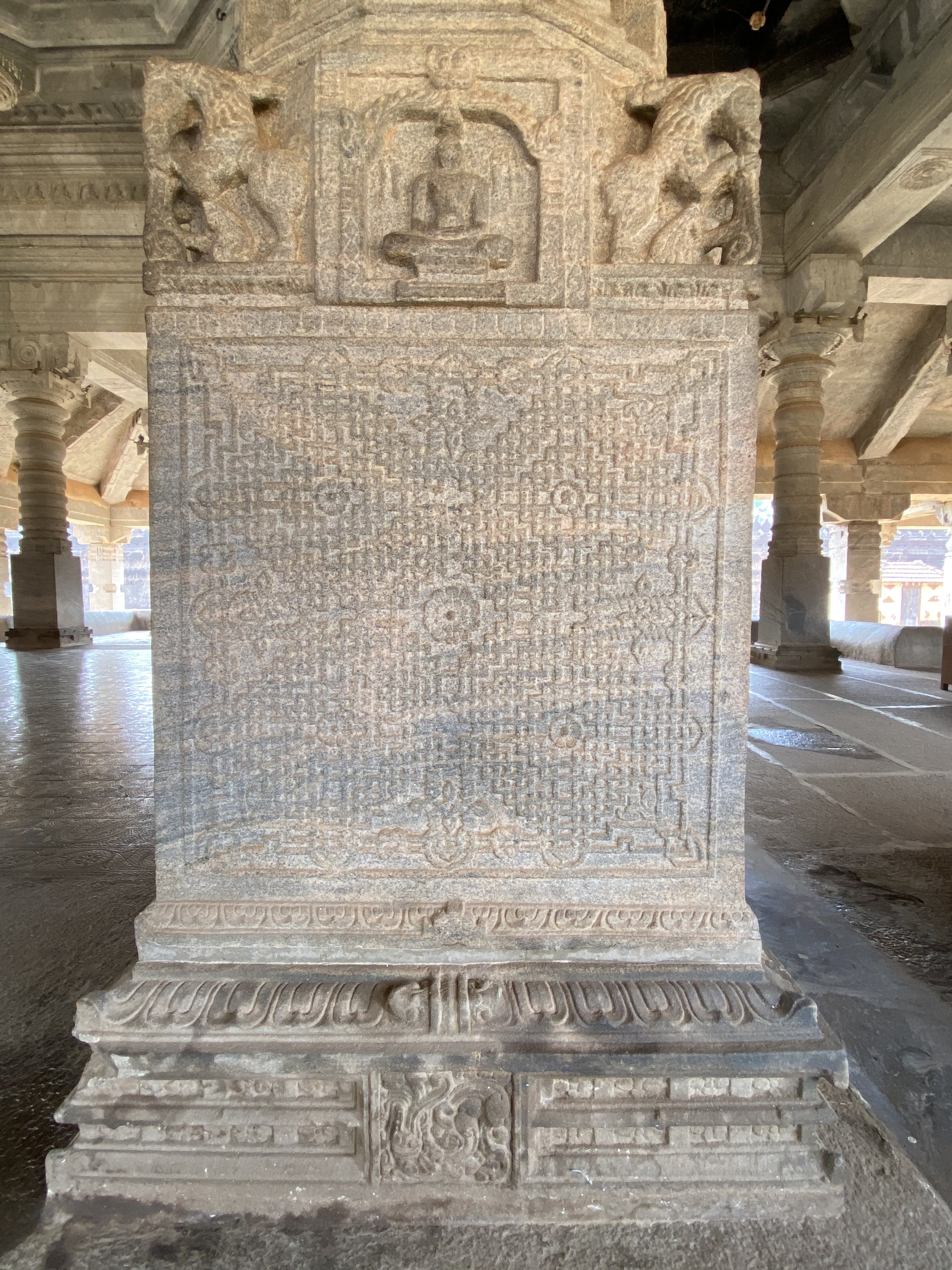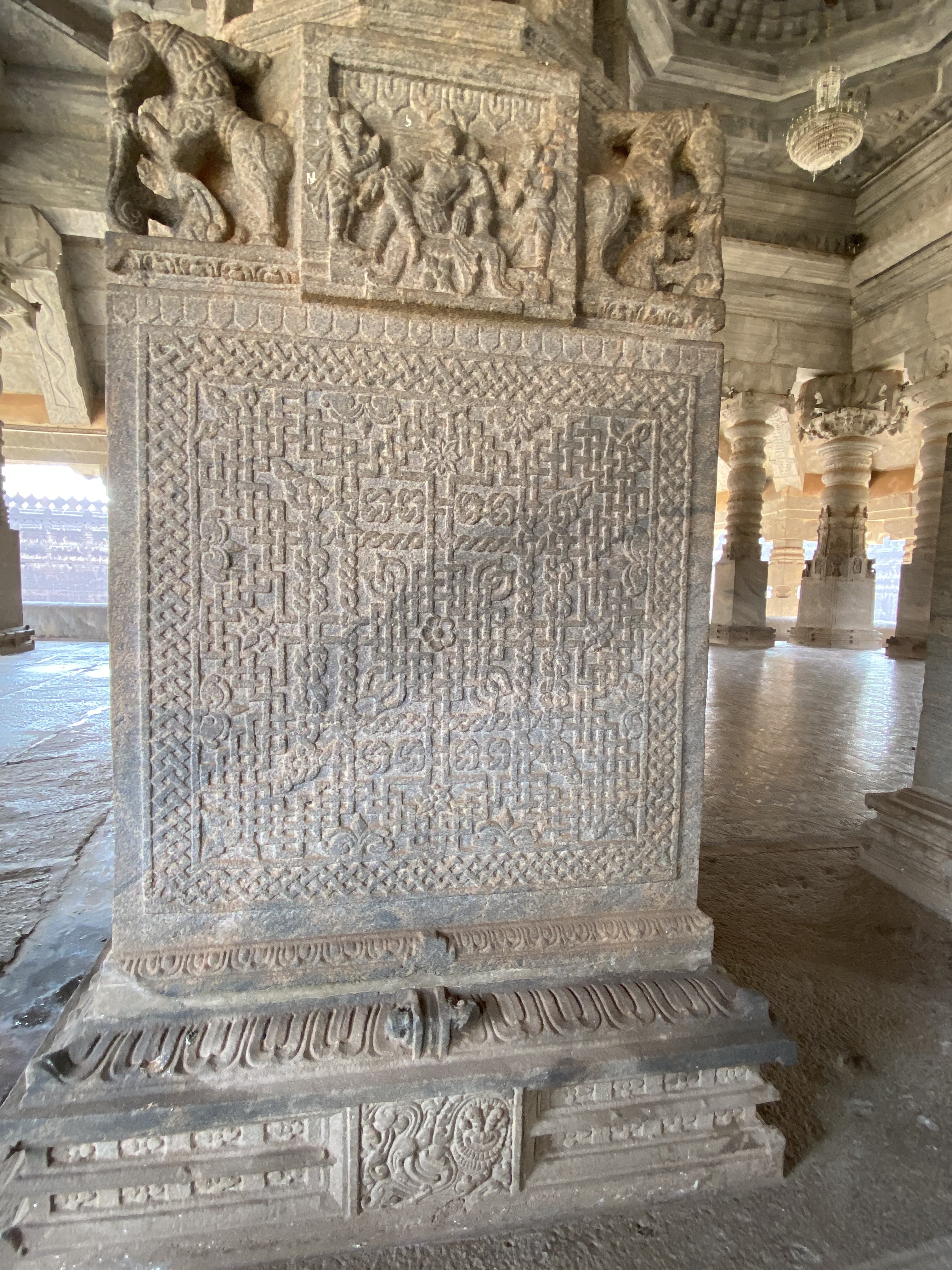 The ceiling of the main mantapa is supported on pillars, most of them with smooth finishes devoid of any embellishments, whereas a few are exquisitely carved like the one below. All the pillars have square bases and capitals. The carvings are mostly floral motifs, mythical animals, geometric patterns, and some even have the tirthankaras carved on them.