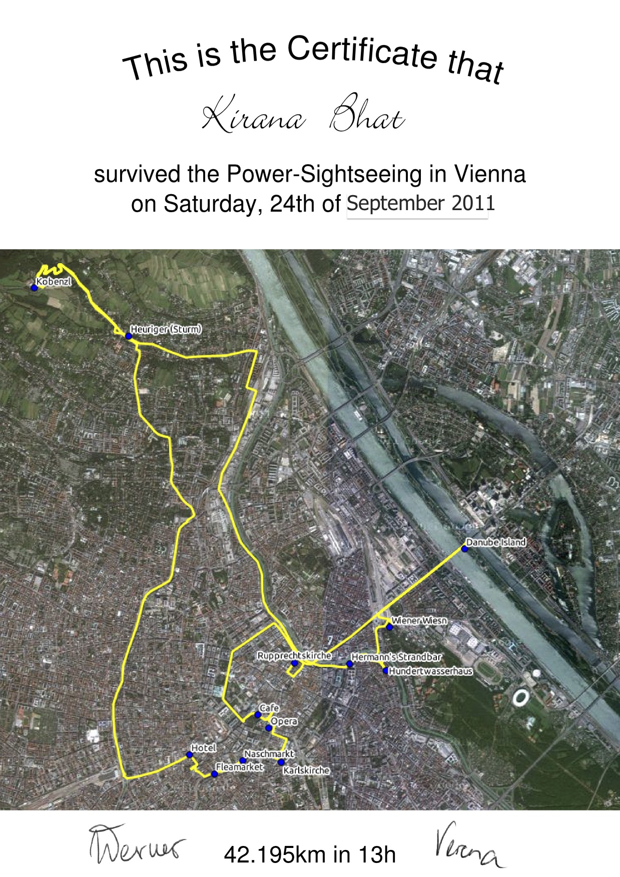 Other than hitting the usual spots in Vienna (the Hofburg palace, the Schonbrunn Palace, Stephansondom, The Spanish Riding School, Hundertwasserhaus, etc) we visited a heuriger, attended an oktoberfest-like event in the Prater called ‘Wiener Wiesn’; which was in fact the first edition of that event, got a view of the city from Cobenzl, tasted and quite liked sturm, and yes, we even managed to fall into the tourist trap of buying tickets to a fake opera! Did you know that there is an old and a new Danube? A channel was built as a flood relief measure and the Viennese now have a narrow but long recreational space. We saw so much more of Vienna than we would have otherwise, thanks to a local friend Werner and his then girlfriend. (They are still together and took the step of tying the knot last year). We walked and trammed so much that each one of us received a ‘certificate of appreciation’ from Werner for our accomplishment 🙂