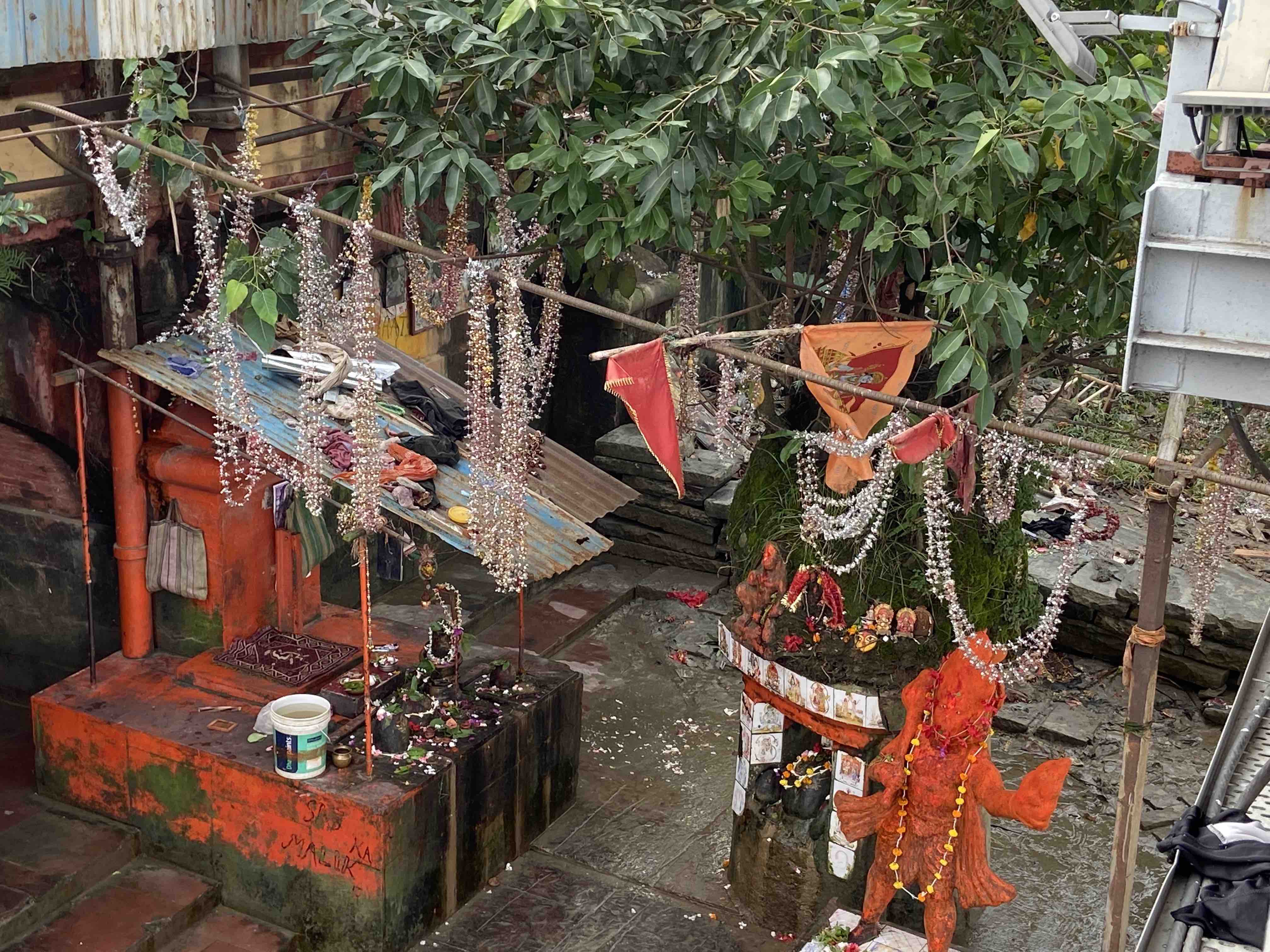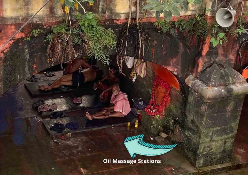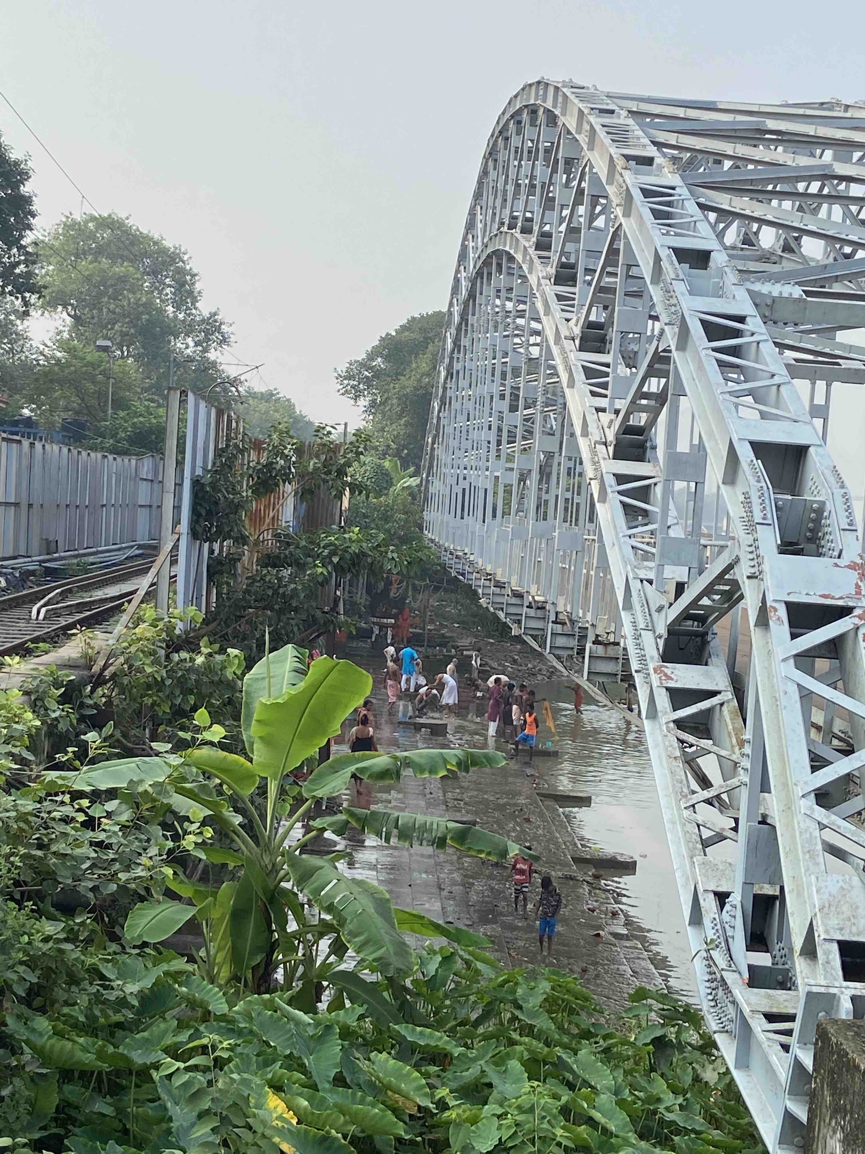 We walked further all the way to the Hoogly hoping to walk along the promenade. Only certain short sections of this walkway were open. When we were on the foot-over-bridge in Babu Ghat, down below we could see idols of gods at the edge of the water, people paying obeisance to the ones that have passed on – both in the river and on its banks, and a masseur at work kneading and stretching a man and two others waiting their turn.