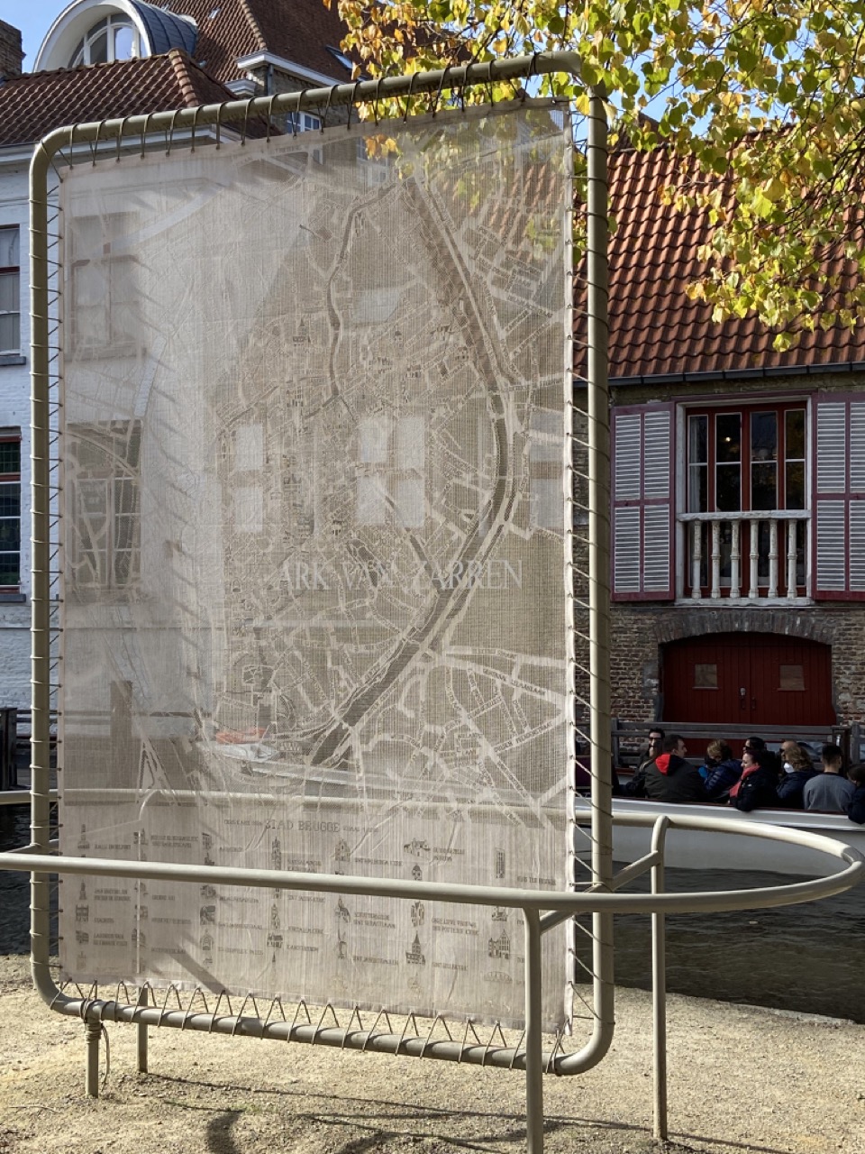 Exit from there on towards the Dvijer, and before you get distracted by the passengers on the canal tour boats, take a moment to admire the map of Bruges stretched out on a metal frame; made of lace! Bruges has a lace centre which I could not visit but I think would have been a wonderful few hours learning the history of lace in relation to Bruges and of course the process of lacemaking.