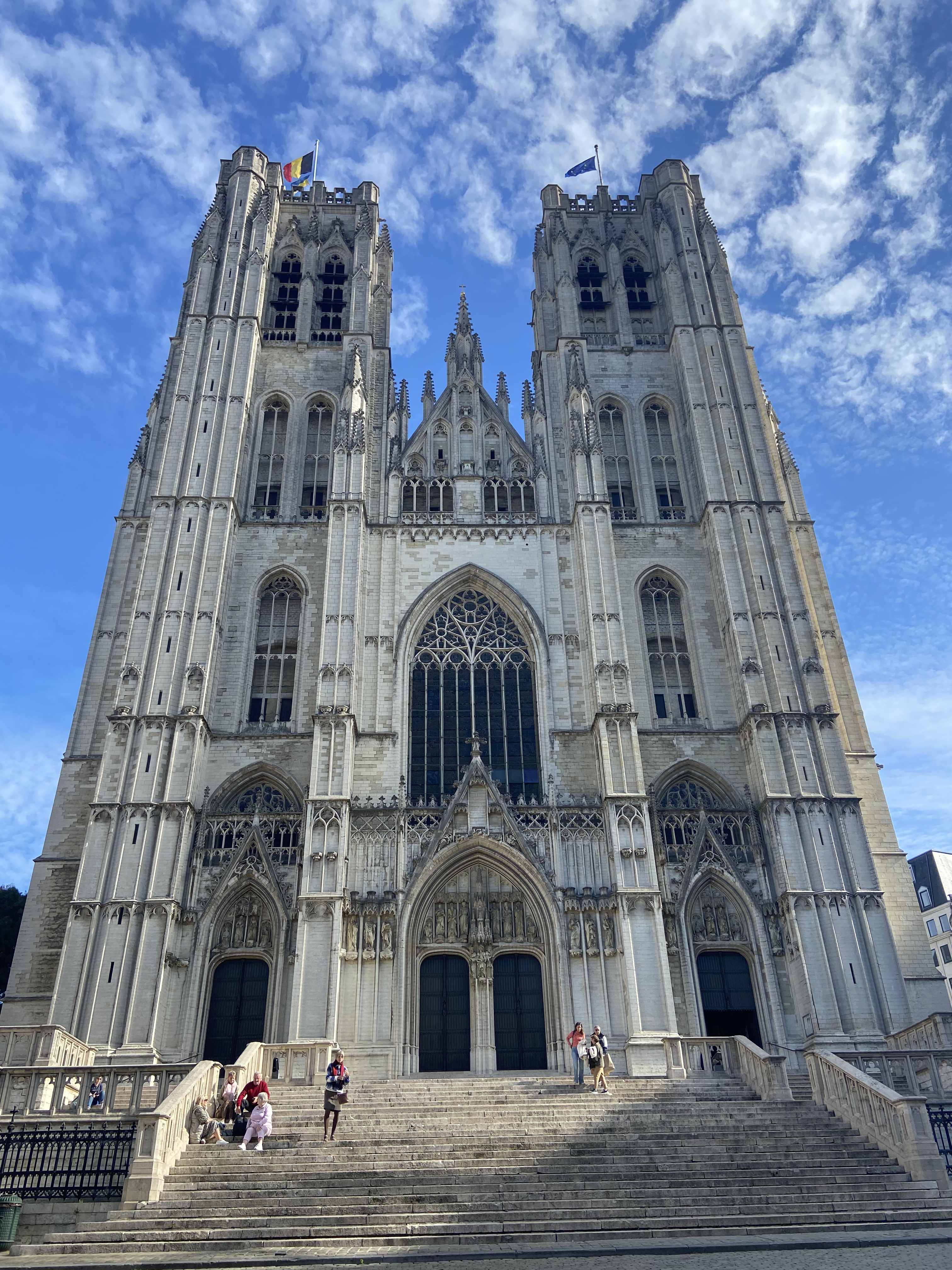 The Cathedral of St. Michael and St. Gudula, dedicated to the patron saints of Brussels, is grand. Its towers loom large and are seen from the Mont des Arts. The 12 apostles line the columns of the church. It has fantastic stained-glass windows, grand pipe organs, a heavy wooden pulpit, and a large baptism font. Every element in this church is colossal. Official ceremonies such as royal weddings and state funerals take place here.