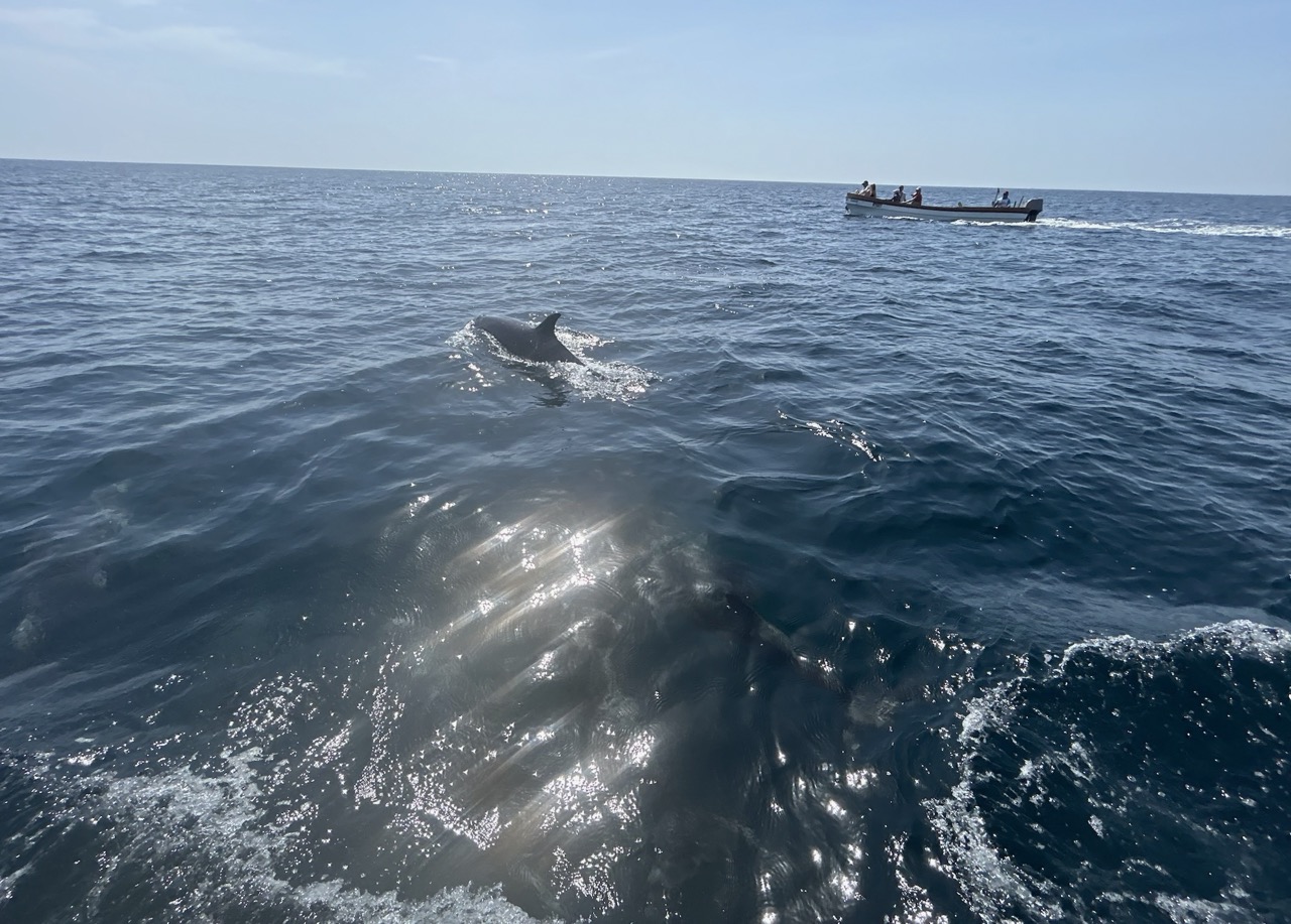 After breakfast, we went on a boat ride – something that will stay with us long! We sped off into the sea and suddenly spotted more dolphins than we had eyes to see! Our boatman kept saying “look, look” and pointing here and there! We could not keep pace! We turned from the blue ocean toward the green Gulf of Oman and were lucky to spot a pair of mating turtles! These shy things disappeared just as soon as they appeared. After all that time on the boat, we learnt to keep pace with the “look, look” commands 😉 After some snorkelling in the sea and the gulf, we rode further into Ras Hadd Lake, which is nothing but a cove for more snorkelling to look at “little little fish”.