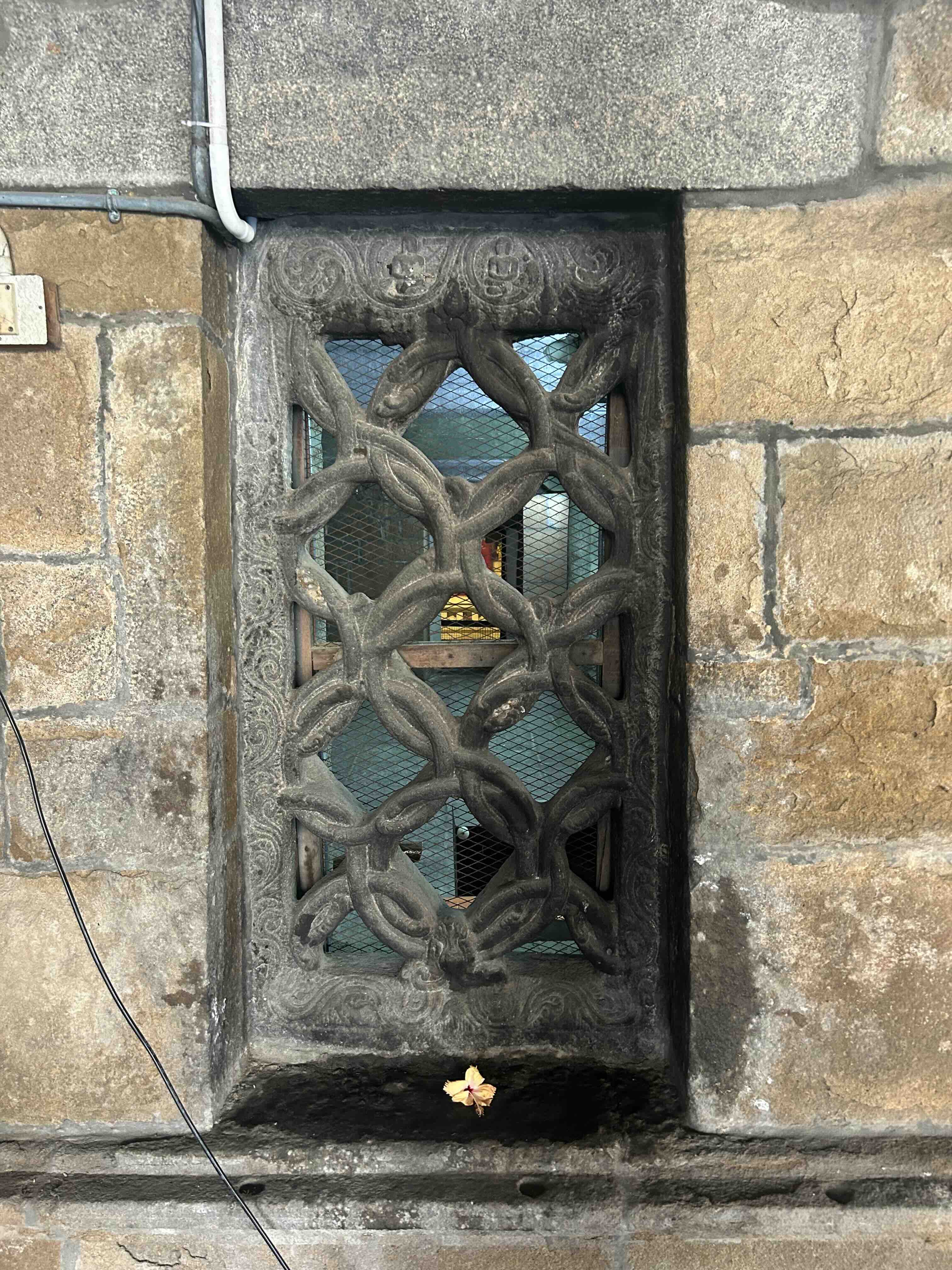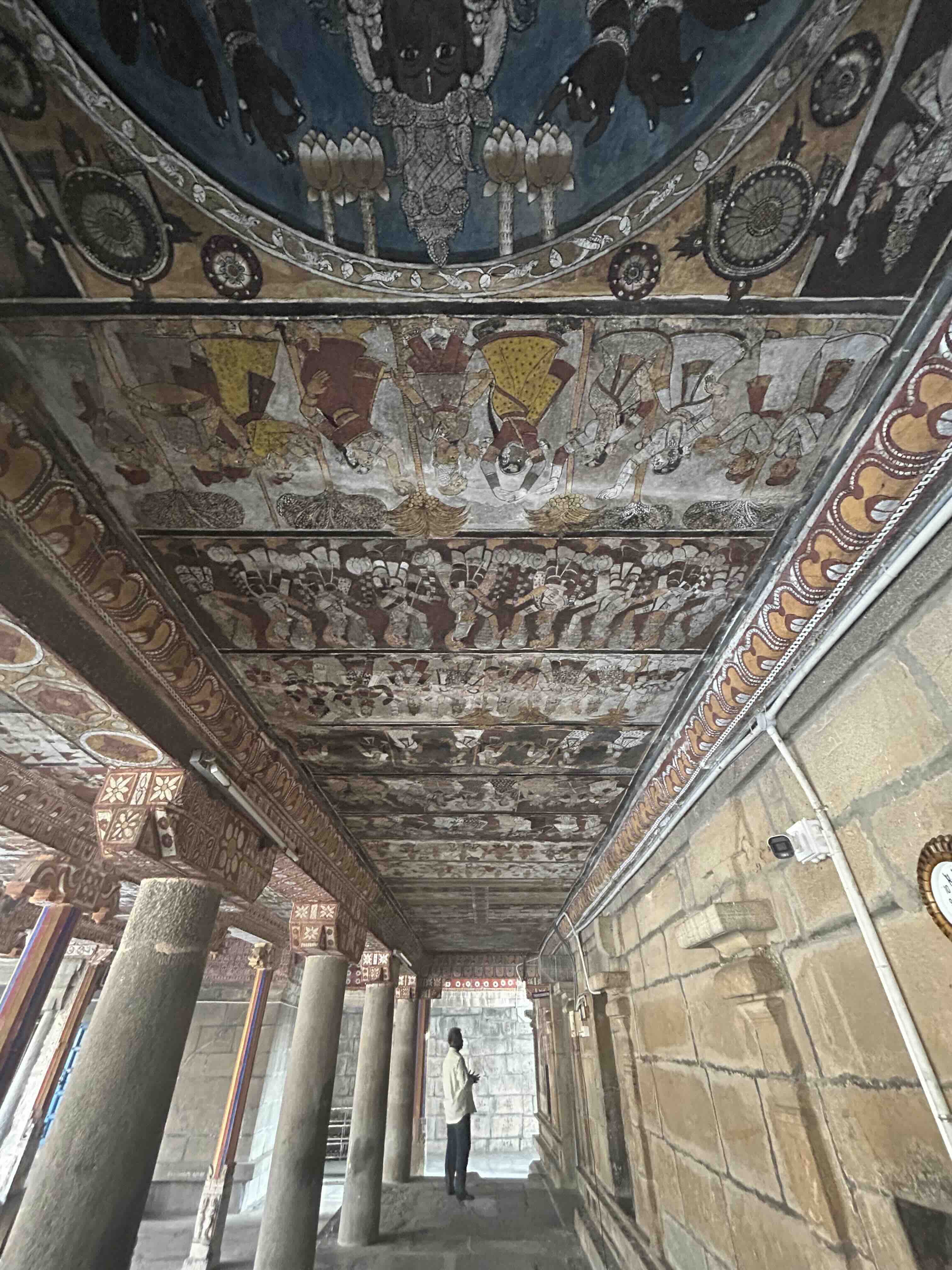 When I visited, the priest was speaking to a group of local art college students about the temple’s artwork. Despite visibly struggling with diabetes (he limped with a swollen, bandaged foot), he patiently answered their questions. He told me that the priesthood here is hereditary, and that he and his wife live on the premises. Many curious students and artists visit to study the mantapa’s ceiling and mural work.